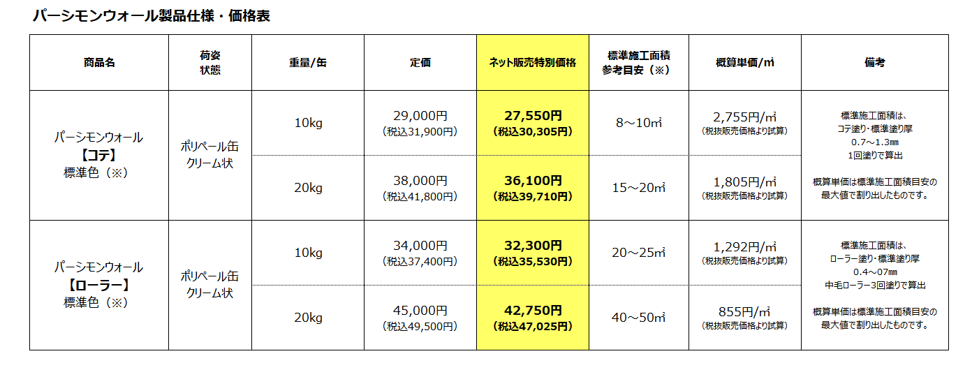※塗り壁施工になれていない場合(初めて塗る方など)、標準施工面積は最小値よりも更に1割程度少な目でみてください。